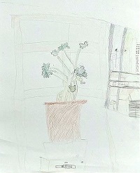 こちらはSZちゃん(小学5年生)。AO君のお姉さんです。アトリエの観葉植物と、窓から見える風景を描きました。遠くの屋根で鳴いていたカラスが描かれています。