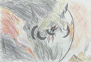 YG君(小学5年生)の作品です。タイトルは「旅するブレイク」。ワシの爪で捕らえられた怪人。YG君らしい世界観です。
