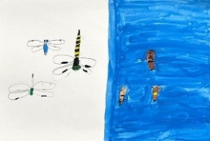 こちらもA君。オニヤンマ、ギンヤンマ、シオカラトンボの成虫と幼虫(ヤゴ)を描きました。ヤゴは水中にいます。ヤゴの生態を理解して描いているのです。
