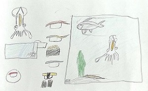 こちらもA君。魚の文様が入った包丁、まぐろ、サーモン、いくら、サバ、玉子、鉄火巻き。活魚水槽に入っているのはイトヒキアジとアオリイカ。A君はお父さんとよく釣りに行くそうですよ(*^^*)