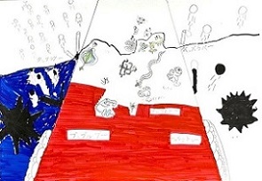 YG君(小学5年生)の作品です。タイトルは「デーモンズ」。パキッとした色彩が新鮮です。ハッとしました。